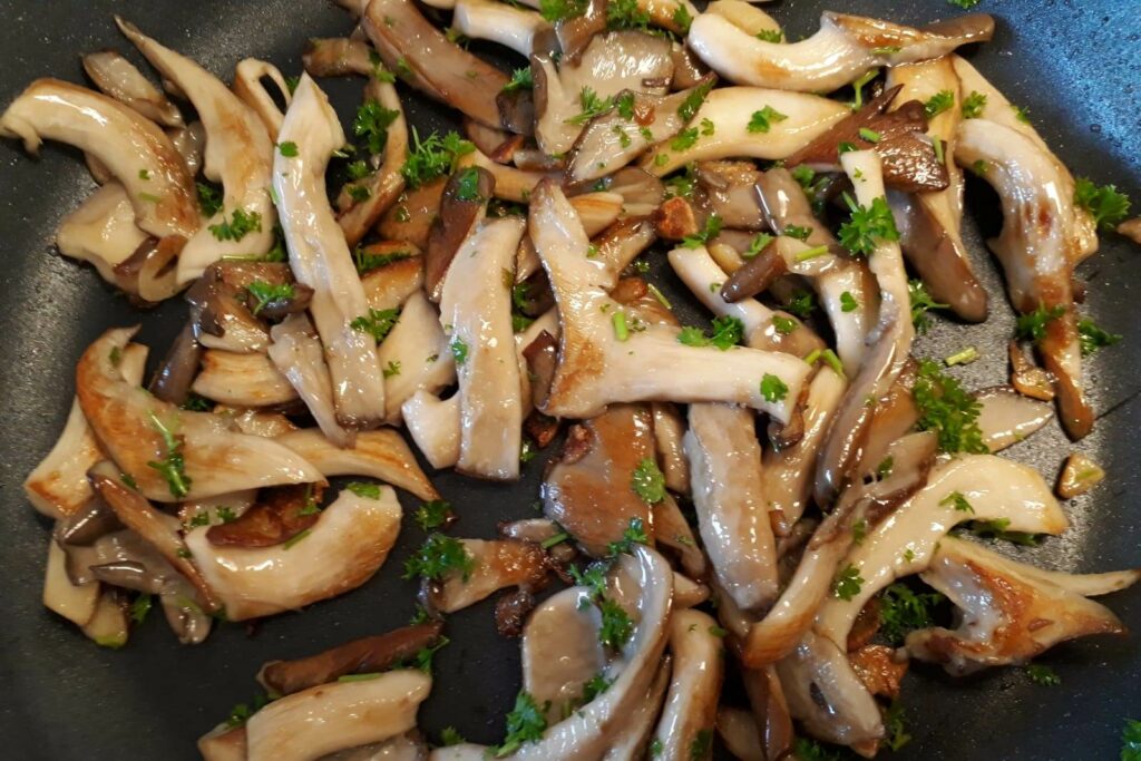 Oesterzwammen gebakken in knoflookolie met peterselie Ben Jeroense van Spijkerzwam op bezorging in Polderdrift
