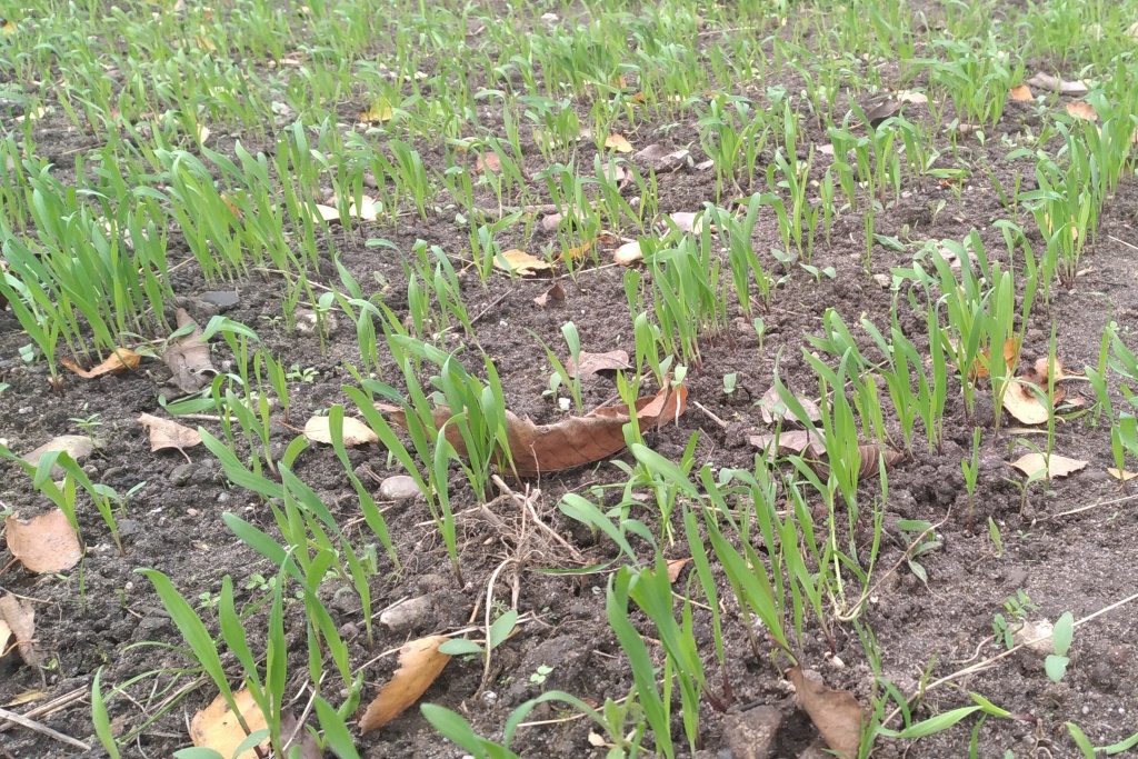 Op 31 oktober hebben we winterrogge ingezaaid. Na een kleine drie weken onder een beschermende deken (tegen poepende katten) komt de rogge nu mooi op. De akker hebben we nu weer iets groter gemaakt. In de zomer zal ze vol staan met rogge en vele soorten akkerkruiden, een lust voor het oog. En hopelijk hebben we ook volgend jaar weer voldoende oogst om er een brood van te bakken.